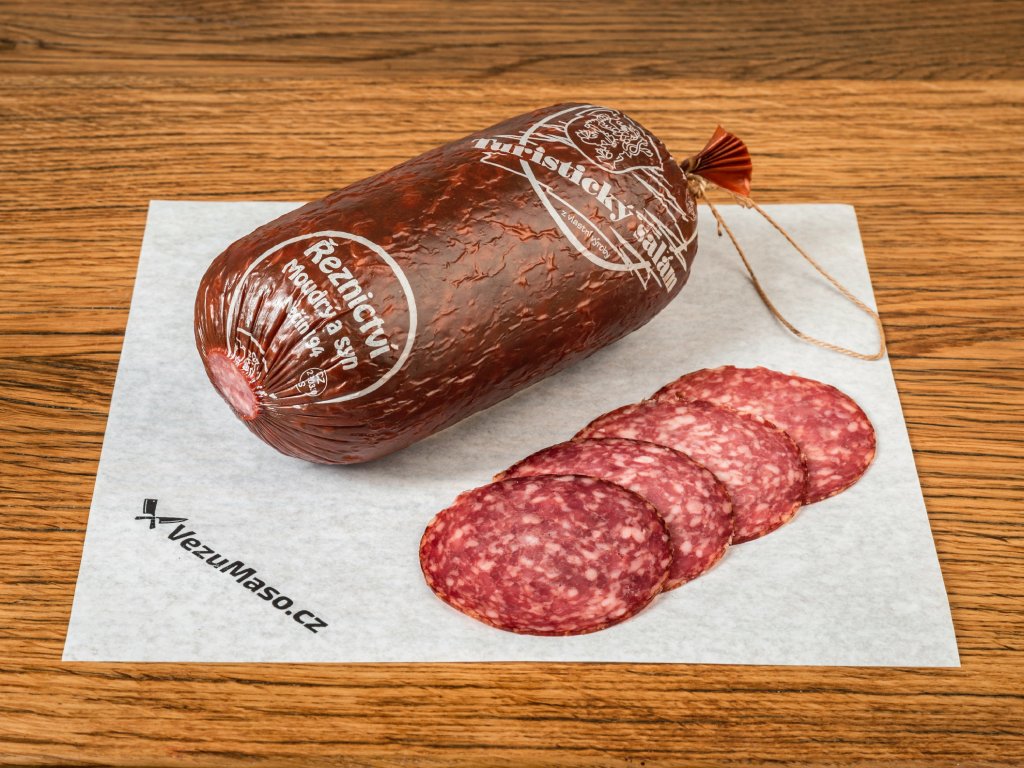 Složení: vepřové maso 65%, hovězí maso 34%, sůl, koření směs Almi - E450, E451, E452, E621, E315. Tepelně upraveno uzením a sušením, 100g výrobku je vyrobeno ze 130g masa