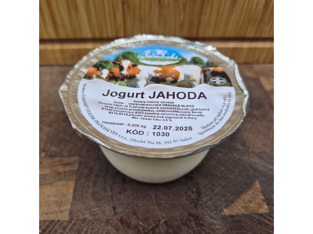 Složení: nestandardizované kravské mléko, ovocná náplň 20 %-jahody-kusové ovoce(44%), cukr, glukózový sirup, ovocný protlak(jablko), voda, modifikovaný škrob, konzervant E202, kyselina citronová, zahušťovadlo E415, E418, přírodní aroma, živé jogurtové kultury