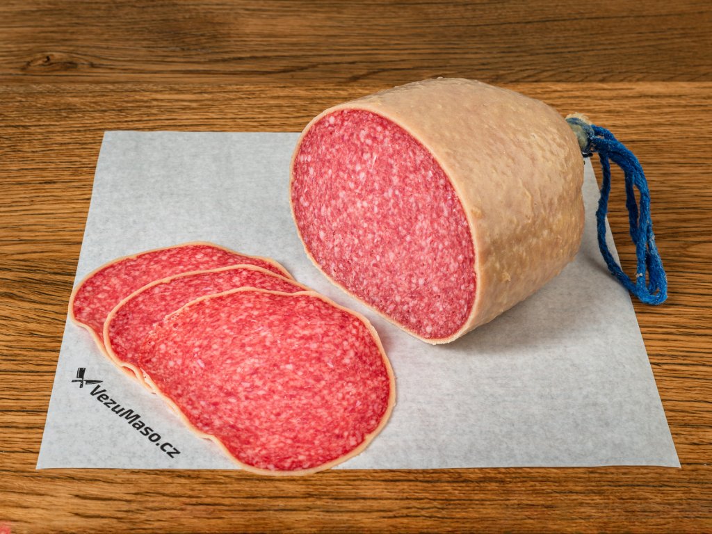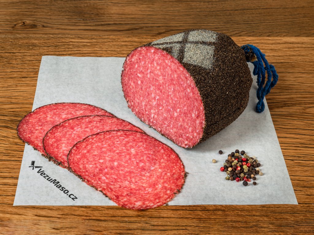 - Španělský fermentovaný salám s pepřem nebo sýrem na povrchu.