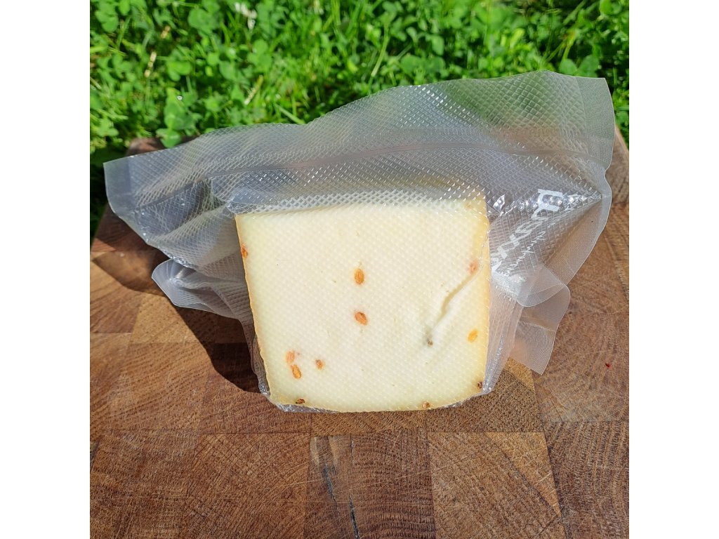 Polotvrdý sýr z kozího mléka s pískavicí.