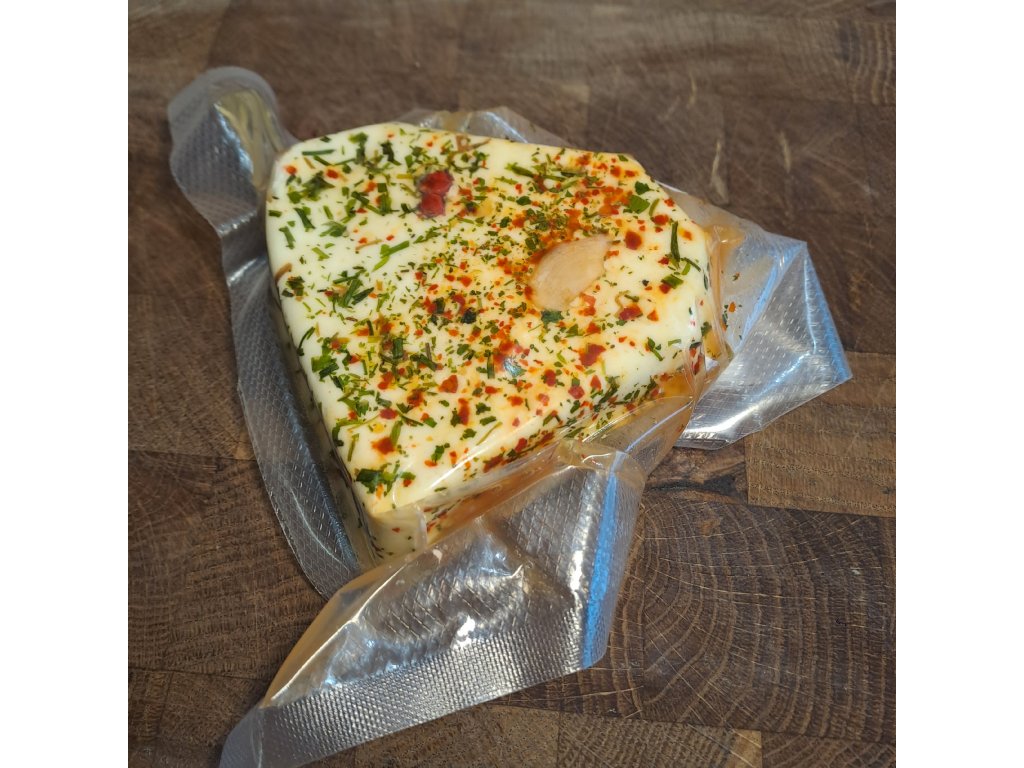 Přírodní čerstvý sýr z kravského mléka s kořením peperoncino a medvědím česnekem.